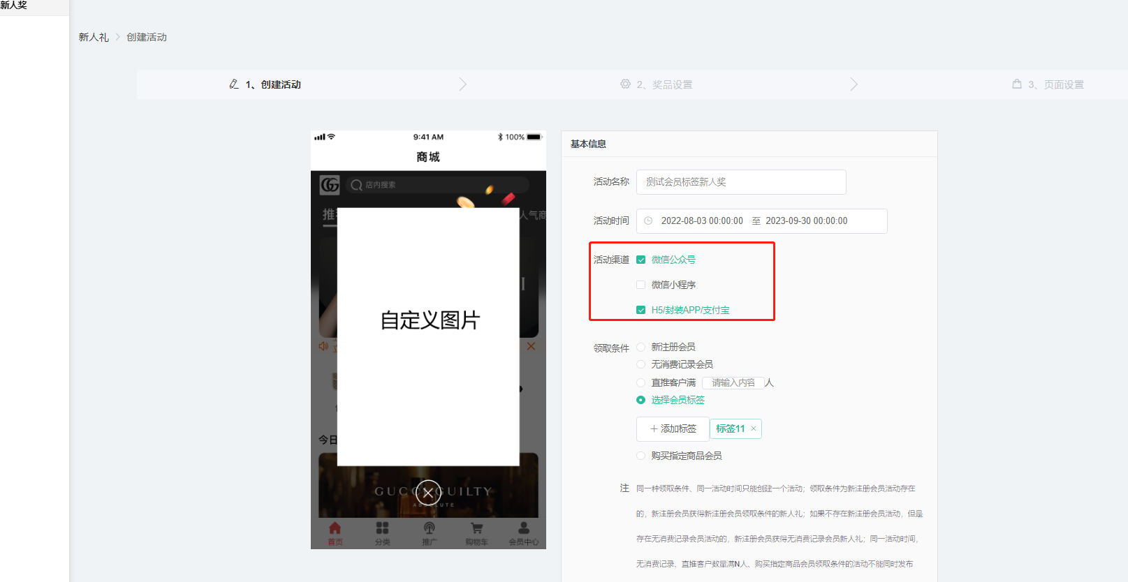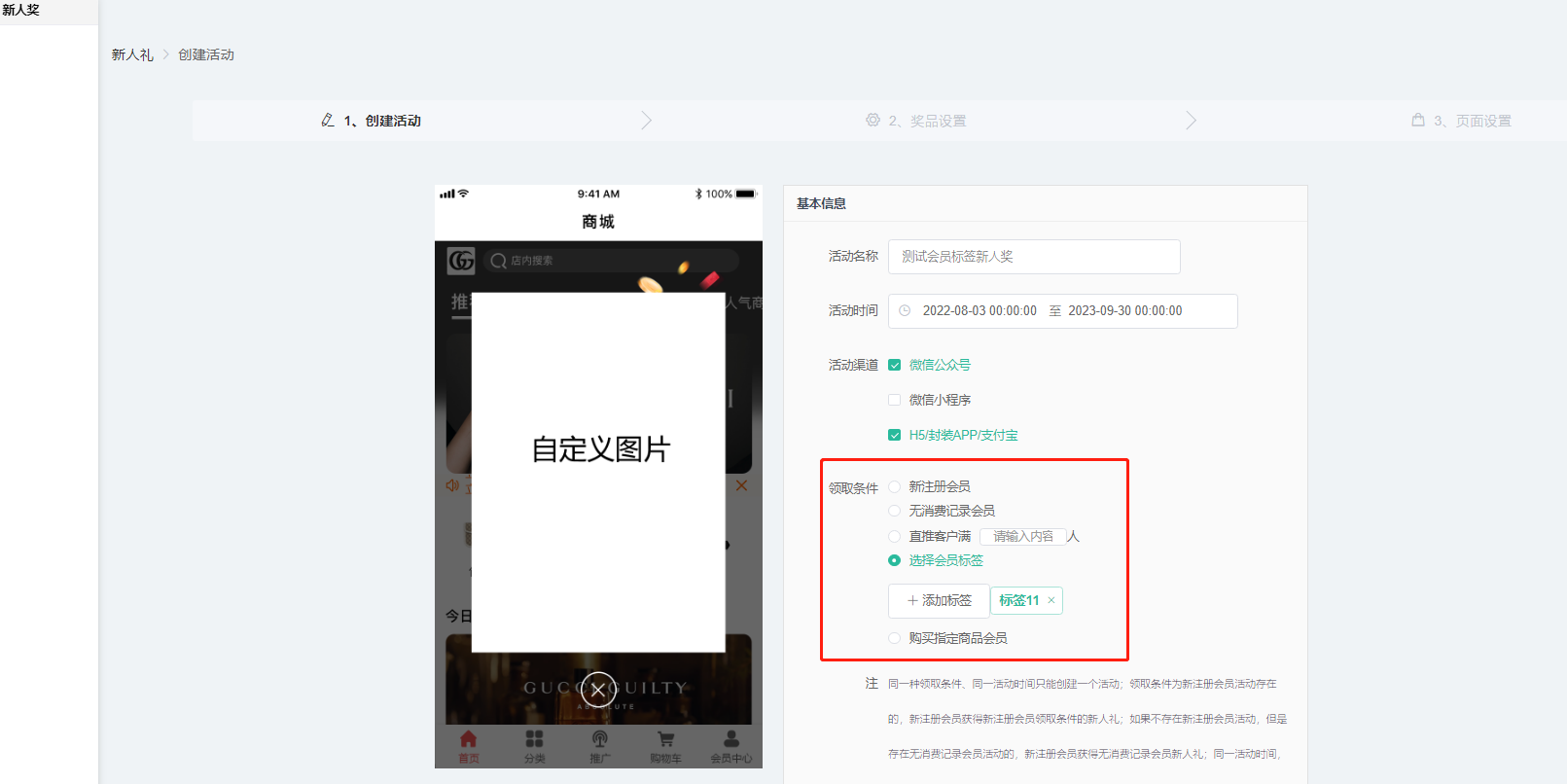 4、选择会员标签:新用户被打上活动所选择的标签,访问首页获得新人奖活动设置的奖励;创建活动后原打上活动标签的会员,访问首页也会触发奖励。