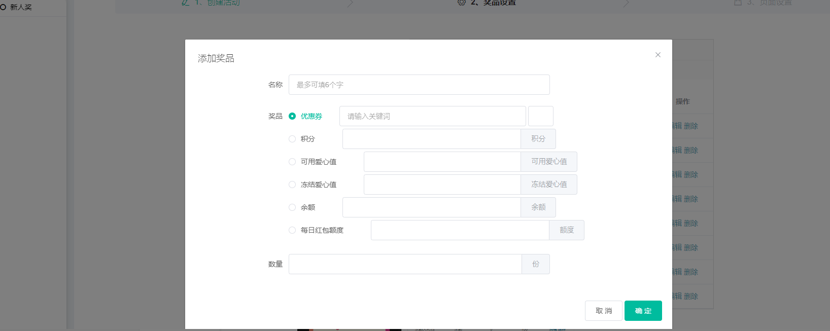 4, 添加奖品:奖品可设置奖励优惠券、积分、余额;设置奖励数量(数量不够则后面的会员不显示该奖品),可添加多个奖品